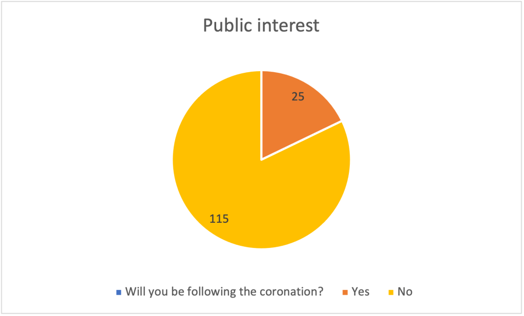 An online poll I carried out showed that most young people aged between 18-24 were uninterested in following the coronation as 82% did not see themselves tuning into the crowning ceremony. 88% thought that the £100 million earmarked for the coronation should have been spent elsewhere.