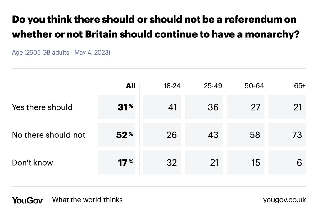 Between the age groups there was a majority who thought that the massive amount spent on the coronation should not have been funded by the government. This is after all a king with a private estate of around £1.8 billion, but taxpayers footed the bill for his crowning ceremony.